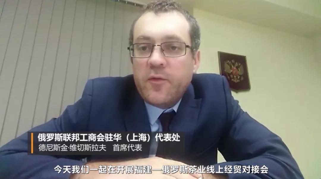 省贸促会副会长傅健、宁德市人民政府副市长黄国璋,以及俄罗斯联邦工商会驻沪首席代表维切斯拉夫、俄罗斯下诺夫哥罗德州工商会主席伊万·拉祖瓦耶夫在对接会上分别致辞,福安市人民政府副市长章斌杰、福鼎市人大常委会主任蔡梅生在分会场对两市及其茶产业进行了专题推介,下诺夫哥罗德州工商会国际项目主任阿纳托利·阿尼先科在线专题介绍了俄罗斯茶叶市场和中俄茶叶贸易等相关情况。
