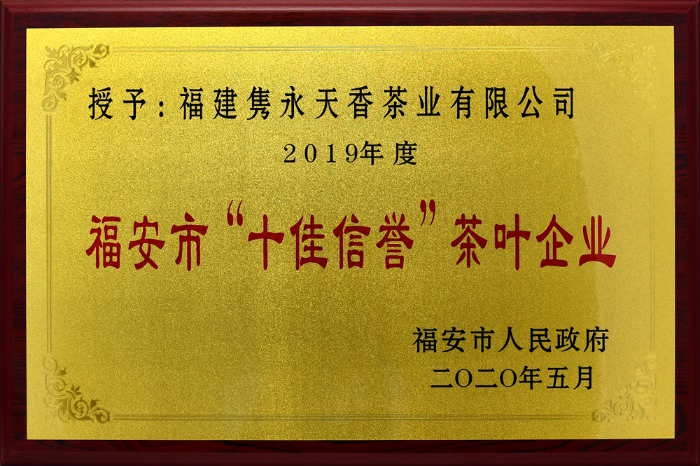 2020年5月29日,隽永天香茶业被福安市人民政府授予“2019年度福安市十佳信誉茶叶企业”称号。