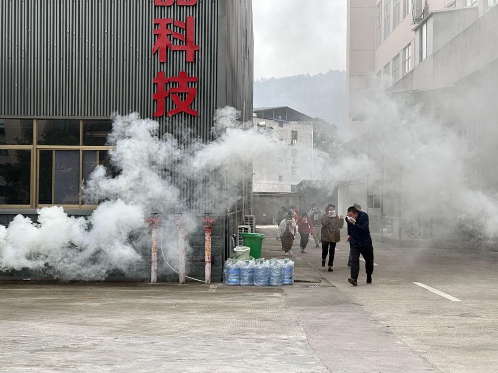 应急疏散过程中现场或安全通道设有烟雾弹,浓烟笼罩,要求现场人员按要求匍匐前进,前进过程中用发放的湿毛巾或现场想办法迅速蘸湿衣物捂住口、鼻,减少烟尘和有毒物质的吸入,有组织、有秩序的选择******路径、快速、安全、的疏散到安全地带。